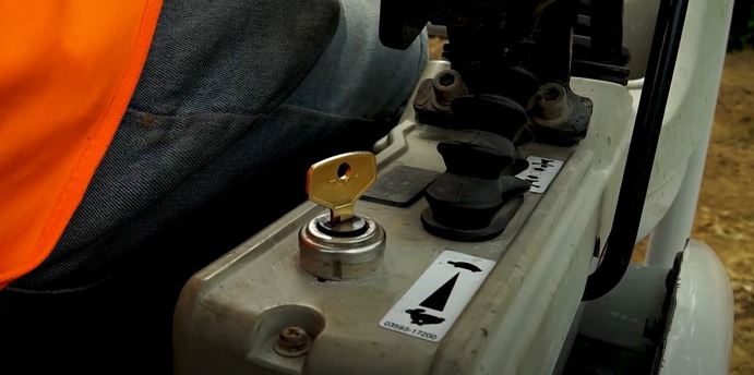 Switch on the machine and let it warm up for a few minutes. After it’s warmed up, increase the revs to full using the throttle control and push down the lock lever.